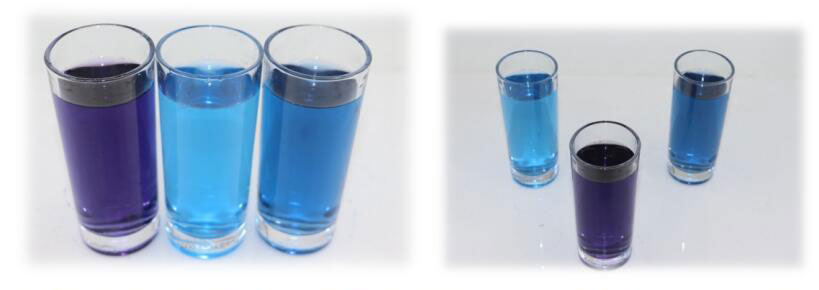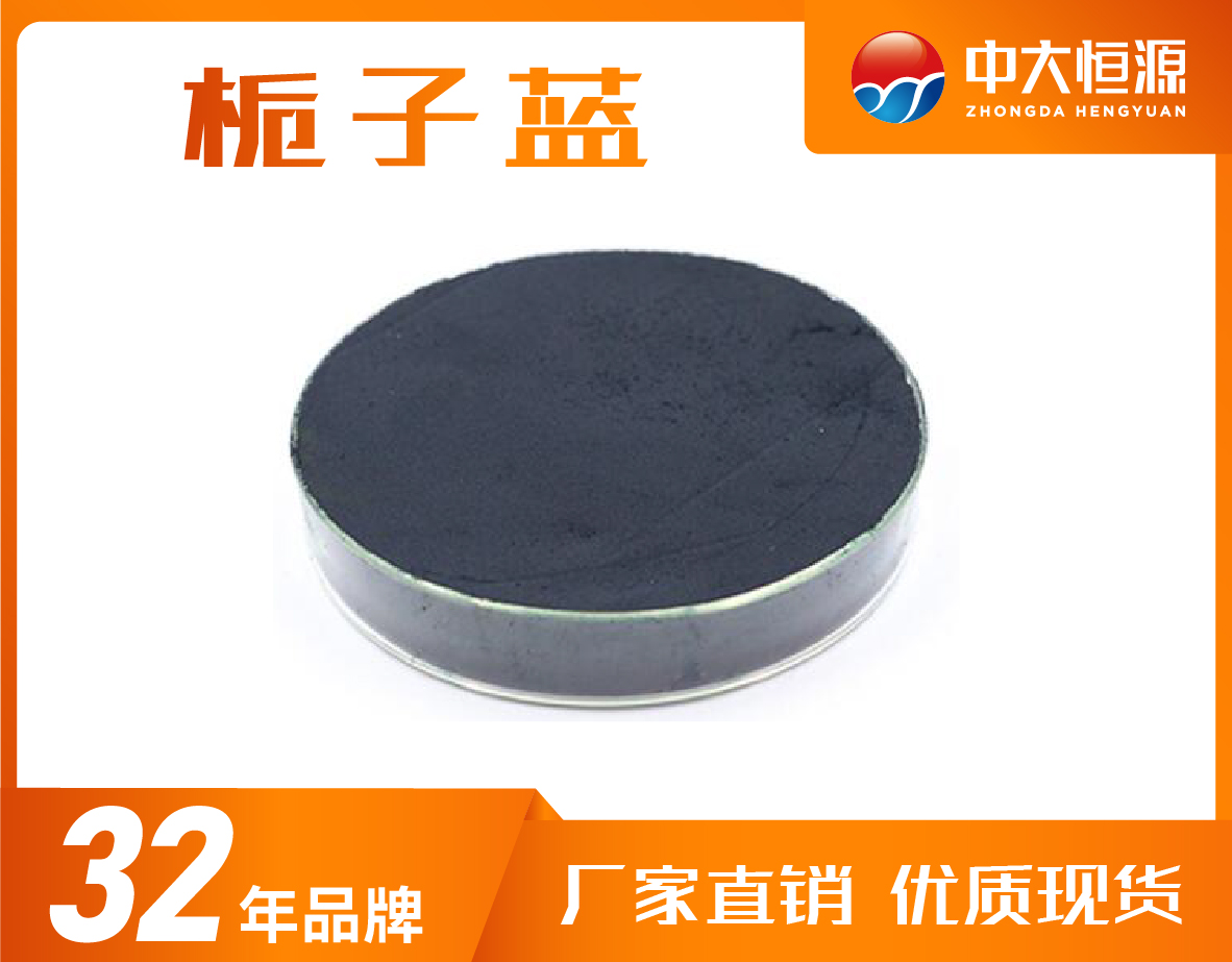 梔子藍是利用梔子果中梔子甙,經過酶解、發酵、精制等工藝制得。深藍色粉末,易溶于水,不溶于油脂。水溶液呈鮮亮藍色,色調不受pH影響,pH4.0-10.0色調穩定,pH<3.0易出現沉淀(普通),pH2.5-4.0不沉淀(耐酸性)。對蛋白質染色力強,光穩定性一般。